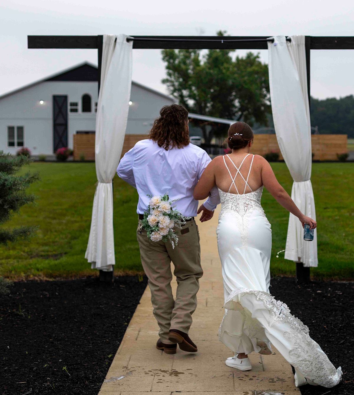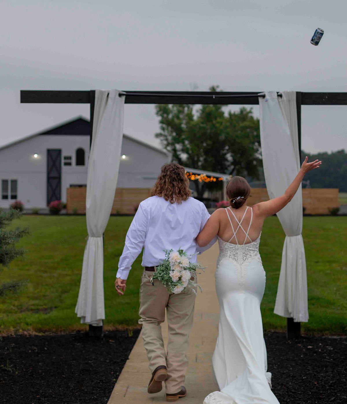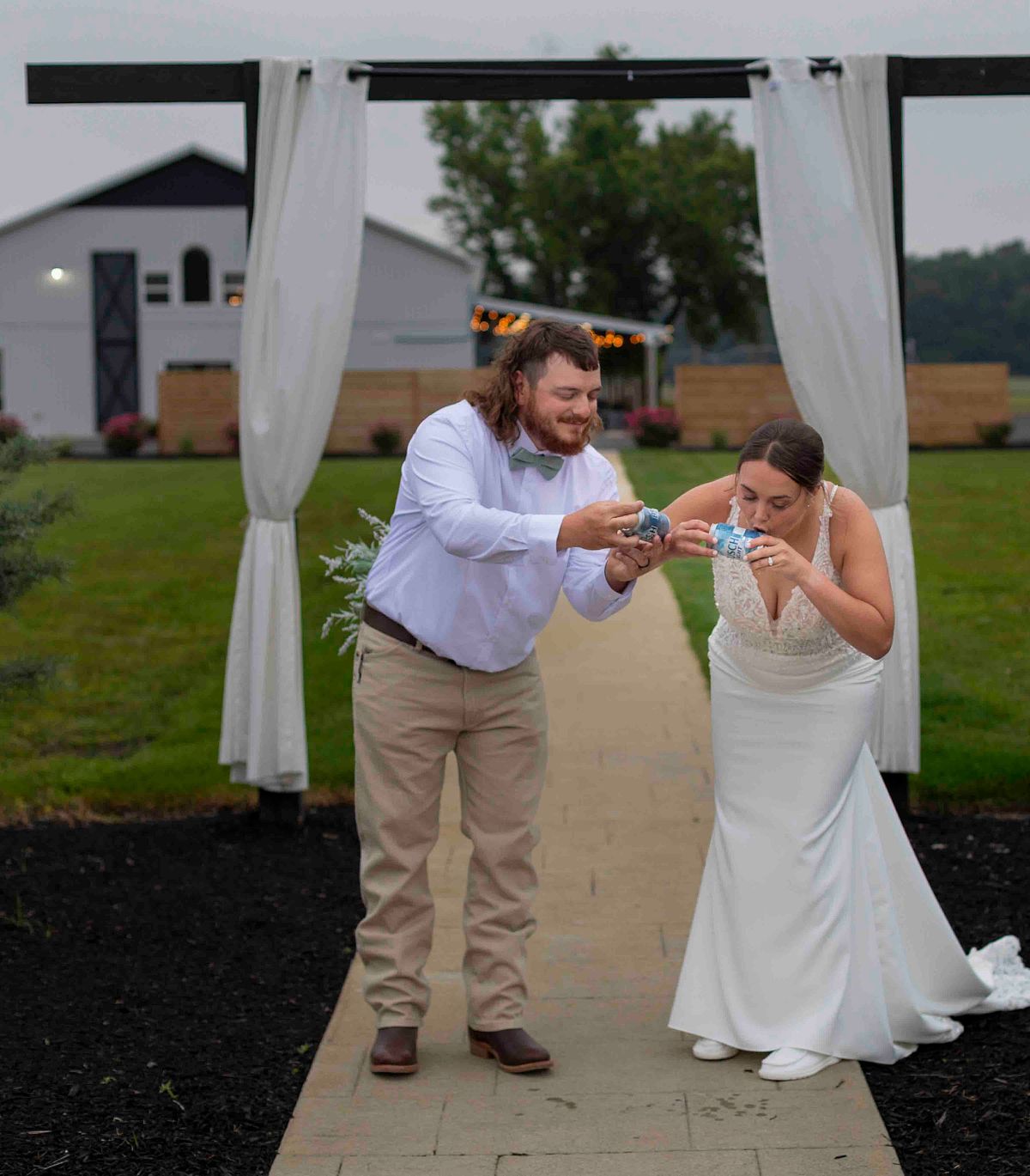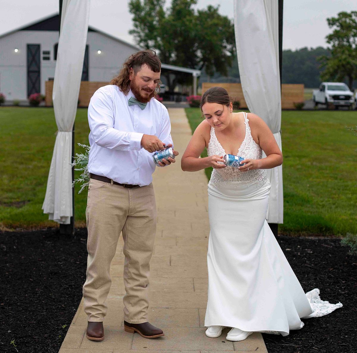 As they were leaving the ceremony area, they noticed two cold beer cans waiting for them. Without any hesitation, they opened them up and chugged them in sync, with huge smiles on their faces. It was such a fun and light-hearted moment that perfectly reflected their personalities. They even tossed the empty cans behind them with a laugh and continued on their way.