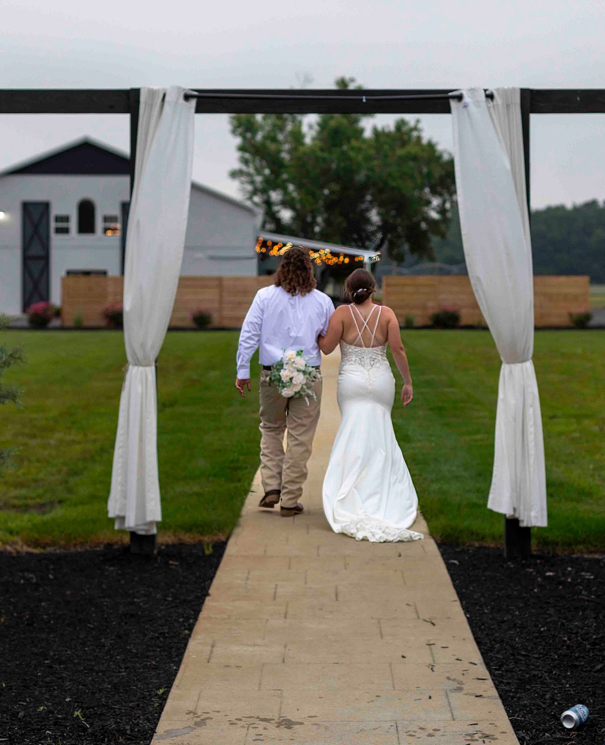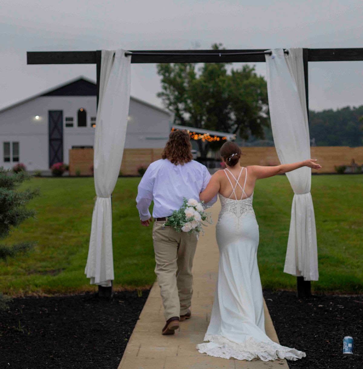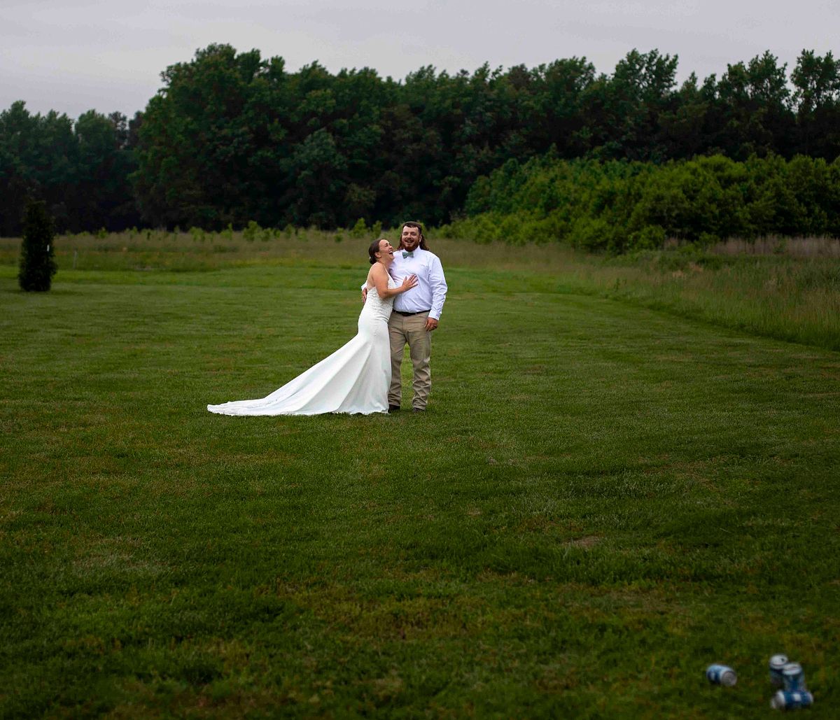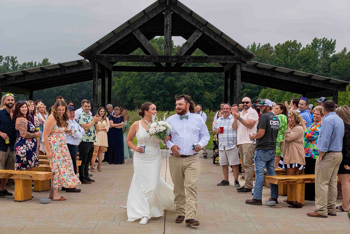 As they were leaving the ceremony area, they noticed two cold beer cans waiting for them. Without any hesitation, they opened them up and chugged them in sync, with huge smiles on their faces. It was such a fun and light-hearted moment that perfectly reflected their personalities. They even tossed the empty cans behind them with a laugh and continued on their way.