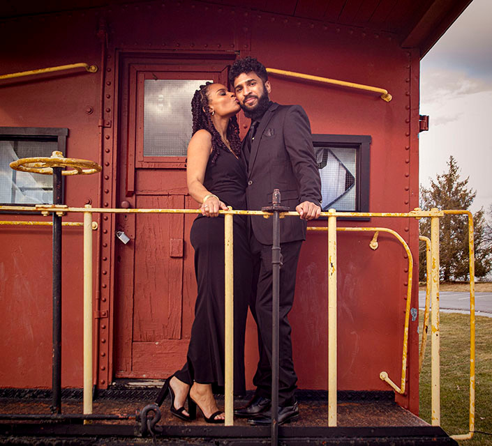 We toured the campus and took some amazing photos around all kinds of different places. We also took some breaks so Martha could warm up for a little bit in her winter coat. When she couldn't stand it anymore, we walked back to the car so they could change the outfits for the next set of photos. While I was waiting in my car (that heat on my feet sure felt good.) I spotted a train trolley sitting next to the football stadium. I love props like that. They are just fun to come across and even more fun when you can utilize them in pictures. The only problem was that we had to climb down a very steep hill and Martha was wearing high heels. Let me just tell you, it took a team effort making sure she was going to make it down and then up the hill on those shoes. Teamwork is everything!!