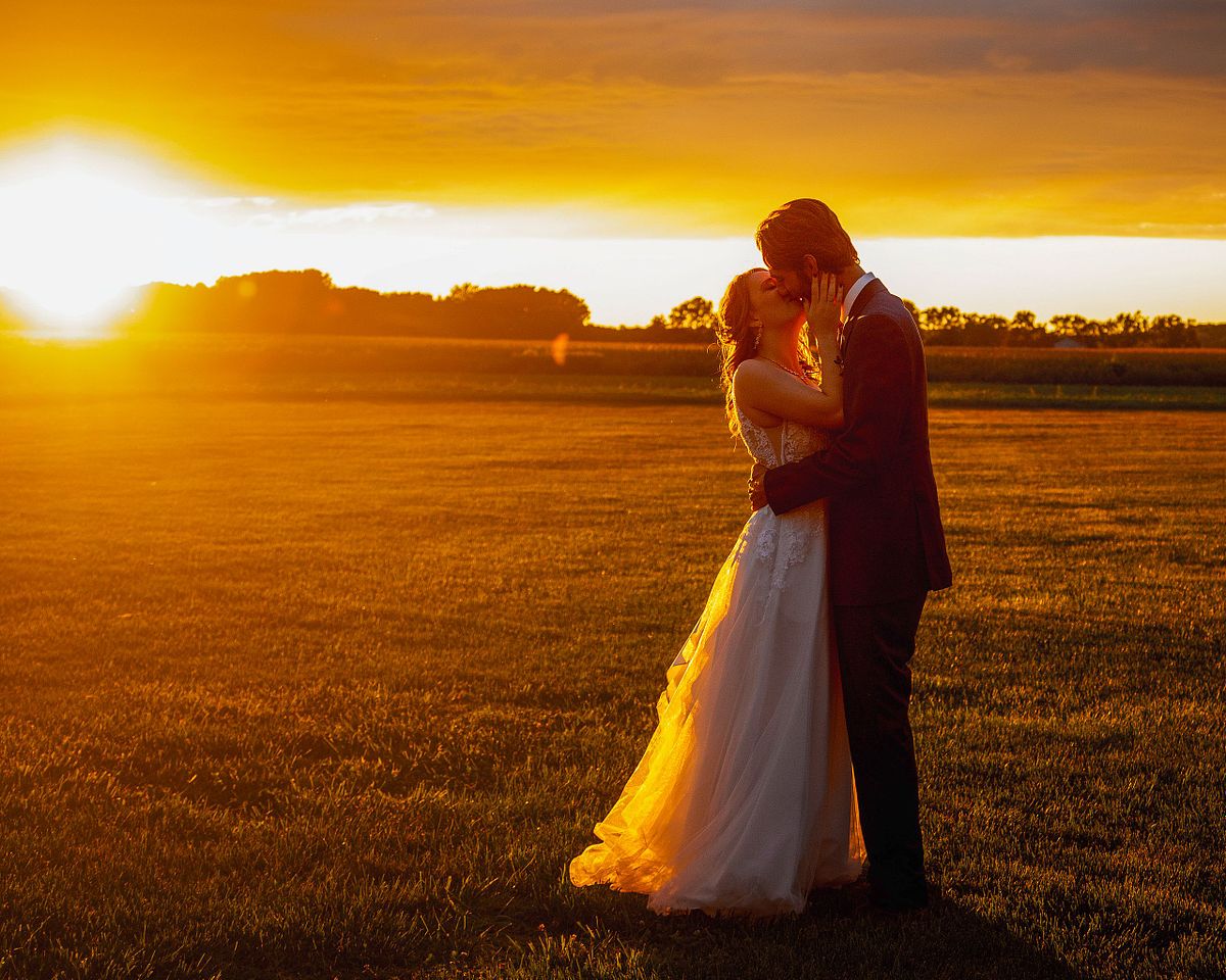 As the evening wore on, the light outside began to transform. The sky was ablaze with hues of orange, pink, and gold – a breathtaking Eastern Shore sunset. I knew this was the golden hour, the perfect time to capture some truly magical portraits of the newlyweds. Stealing Alexis and Jonathan away from the festivities, we ventured out into the fields.