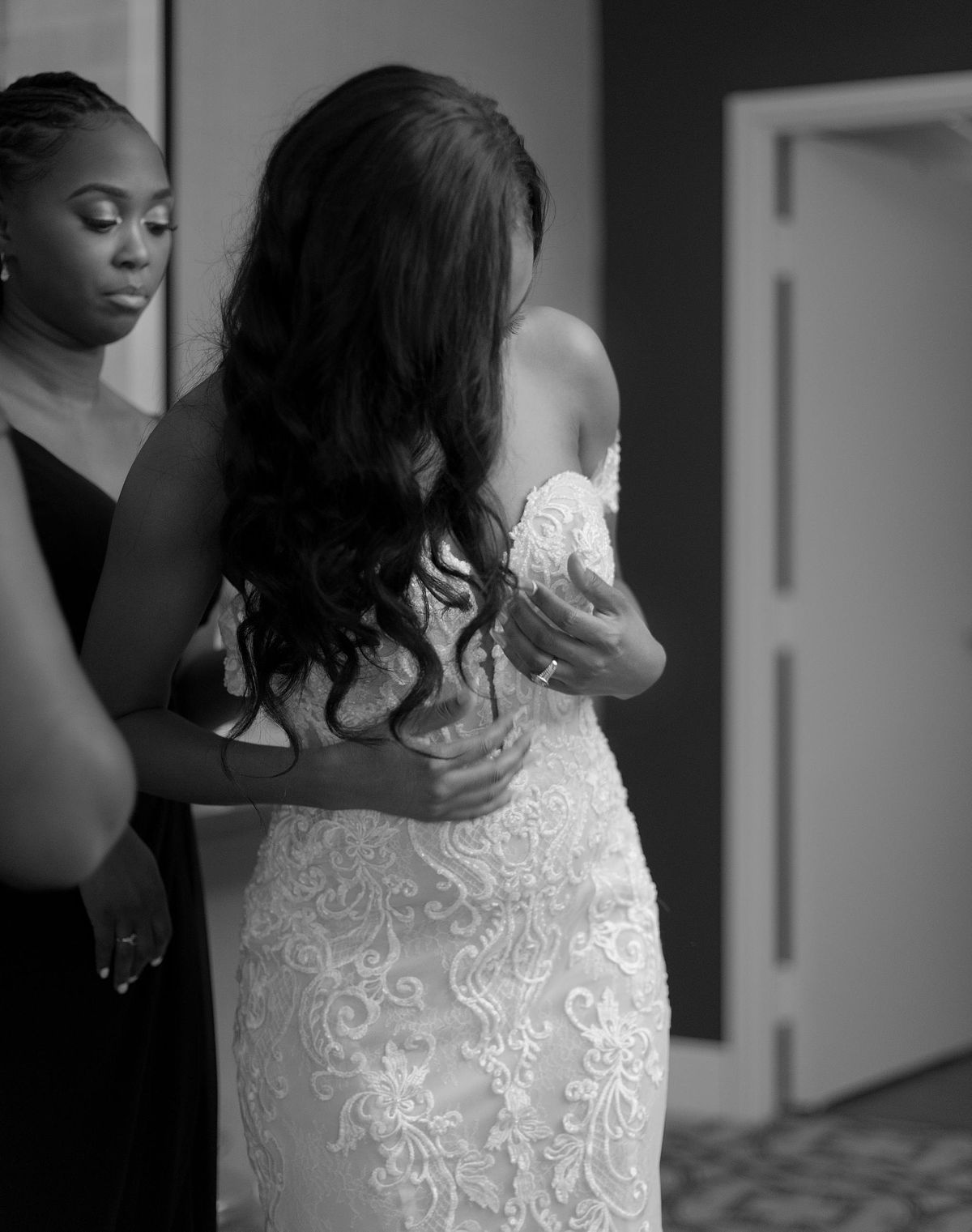 Tiana and Bernard's Wedding at the Delta Hotel in Hunt Valley started in the early morning hours. Getting ready with ten bridesmaids requires not only one hotel room but two. Can you imagine having two sets of make-up artists and hairstylists buzzing about in one hotel room trying to get everyone ready to go? What a daunting effort! Having witnessed many getting-ready parties, I can attest that sometimes the party before the wedding is as crazy as the reception.Â
